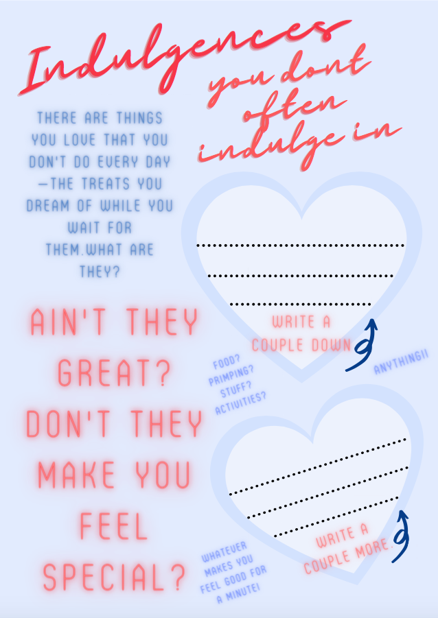 You've got to give yourself treats, and sometimes it's hard. This zine is here to help! Eight pages of workbook that will help you make time, space, or the budget for a little lifestyle luxury.
